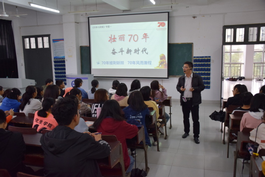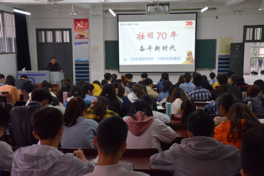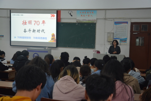 为深入学习贯彻习近平总书记在庆祝中华人民共和国成立70周年大会上的重要讲话精神,大力宣传新中国成立70年来的光辉历程和伟大成就,弘扬社会主义核心价值观和新时代爱国奋斗精神,引导青年学生坚定理想信念,厚植爱国情怀,激发报国之志。按照学校工作安排,结合大学生形势政策教育课,10月16日下午,我院在青年学生中组织开展了以“壮丽七十年、奋斗新时代”为主题的宣讲活动。我院院长郭孟萍、院党委书记黄良辉、团总支书记南建忠分别担任主讲人,为我院2018、2019级学生作了生动精彩的专题授课。