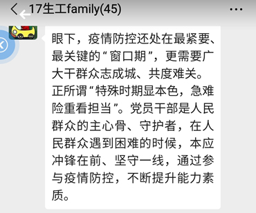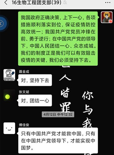 本次教育活动以网上主题班会、微信、QQ群讨论等多种形式在全院范围内开展,各班主任及辅导员老师引领学生结合疫情中出现的感人事迹和制度规章等多个方面展开积极讨论。就笔者了解,作为本次主题教育活动的主要参与者,学生们各抒己见,当谈到爱国主义一词时,他们赞叹着在疫情暴发中踊跃出的一大群为人民而选择逆行的勇士,他们感慨着“一方有难,八方支援”、“快速反应,分秒必争”的中国姿态与中国速度。针对此次活动,17生工班在辅导员詹太华老师的带领下采用特别的方式对活动予以响应,用四天的时间内完成了从老师发出号召到学生全员参与的全过程。他们把催人泪下的抗疫瞬间,真诚坚定的加油呐喊呈现在一段段视频中,别开生面的是展现形式,亘古不变的却是莘莘学子心中的爱国情怀。其余班级同样对爱国主义这一主题展开了热烈讨论,在拥护与歌颂中国共产党的同时,也让每一个活动参与者的拳拳爱国心得到了温润滋养。
