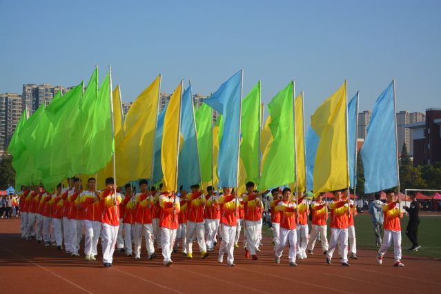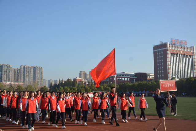 随着运动会正式开始,各方阵依次入场。此时进行曲骤然响起,一个个方阵排着整齐的队形,大踏步向主席台走来。他们个个衣着鲜艳,面带笑容,昂首阔步,展示出了青年特有的朝气与活力。