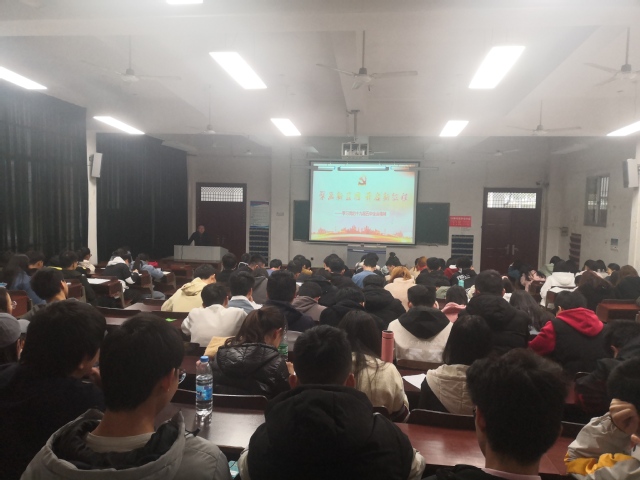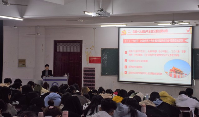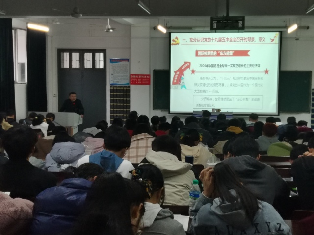 (学生通讯员 邓文俊 尹秋艳) 为推动广大青年学生深入学习领会党的十九届五中全会精神,引导和激励他们厚植爱国情怀,永远跟党走,奋斗新征程。按照学校形势政策课统一安排,11月25日下午,我院在青年学生中组织开展了学习党的十九届五中全会精神专题宣讲活动,校党委委员、纪委书记张梅,马克思主义学院党总支书记朱向华,我院党委书记黄良辉、专职辅导员彭勃分别担任主讲人,为我院2019、2020级600余名青年学子作了精彩授课。