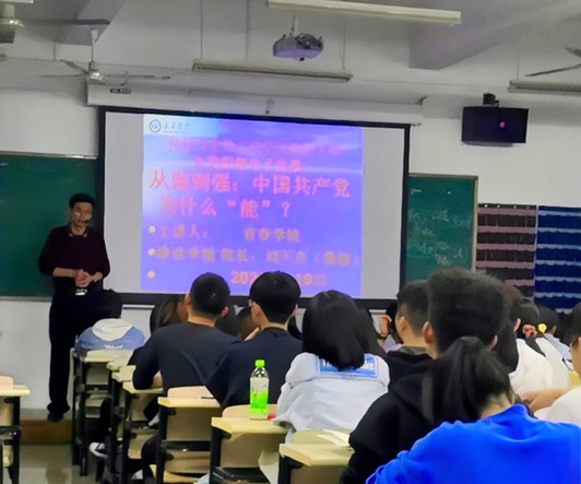 11月19日晚,我校政法学院院长刘天杰教授以《从弱到强,中国共产党为什么“能”》为题,为培训学员作了专题授课。刘教授以“从弱到强与发展壮大”、“坚定信念与服务人民”及“百年逐梦与经验启示”为切入点,精准阐述了中国共产党发展壮大的曲折历史及党领导人民建立新中国的艰辛历程。他勉励同学们,作为新时代的新青年,要时刻谨记革命先辈英勇奋斗的初心,时刻铭记党的光荣使命,做实现中华民族伟大复兴的先锋力量。