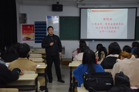 11月23日晚,我院党委专职组织员南建忠老师围绕《入党条件、党员发展程序和对大学生党员的要求》为学员们作专题授课,他结合实例强调了申请入党必须要符合的基本条件及履行的程序。勉励同学们要不断加强党性修养,做到政治上思想上真正入党,始终保持共产党员的先进性,充分发挥入党积极分子的模范作用,争取早日加入党组织。