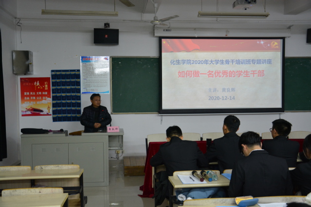 14日晚开班仪式结束后,我院党委书记黄良辉为培训班学员作了《如何做一名优秀的学生干部》的专题授课。他强调,大学生骨干队伍建设是高校思想政治工作的重要部分,培养青年马克思主义者是高校立德树人的重要使命。大学生骨干培训的目的是培养提高学生干部的政治素养、思维能力、工作能力和敬业奉献精神。他对学员们提出了三个方面的要求和希望:一是坚定理想信念,加强政治修养;二是讲究工作方法,提高工作能力;三是严格要求自己、发挥带头作用。