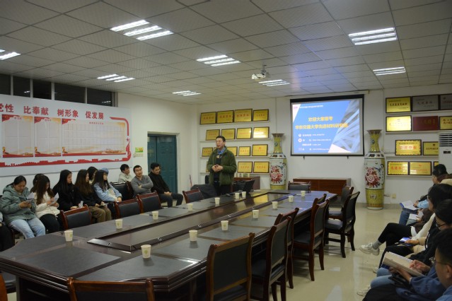 会议伊始,敖海勇副院长向我院学子详细介绍了华东交通大学的校园环境、校史及校情。随后,他介绍了先进材料研究院的总体情况,他指出,先进材料研究院主要研究方向是生物医用复合材料,院内建立了完备的科研平台,拥有先进的科研设备,组建了一支专业的科研团队,科研能力十分丰厚。研究院的独特优势,其一是经常组织对外交流活动,从而确保学生后期的全面发展,另外,研究院还会对表现优异的学生给予丰富的奖励,从而为优秀的学生们提供良好的发展条件。在介绍情况时候他还着重介绍了先进材料研究院的校训:敢为人先,材优干济,其意思是敢于尝试、敢于探索、敢于创新、才能优异,他希望广大学子都能大胆探索和创新,让自己变得更优秀。