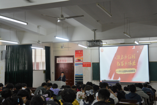四位宣讲老师以《踏上新征程,书写新伟业》为题,从今年全国“两会”召开的背景和意义开讲,重点围绕政府工作报告、习近平同志在“两会”期间的重要讲话精神、会议审议通过的《中华人民共和国国民经济和社会发展第十四个五年规划和2035年远景目标纲要》、《全国人民代表大会关于完善香港特别行政区选举制度的决定》等主要内容及其重要意义,为同学们作了精彩阐释和深入解读。宣讲过程中老师们特别强调指出,2020年是极不平凡的一年,在以习近平同志为核心的党中央坚强领导下,全党全军全国人民团结奋斗,取得了抗击疫情、脱贫攻坚和经济社会发展的举世瞩目成就,彰显了我们党以人民为中心、为人民谋福祉的执政理念和执政能力,彰显了中国特色社会主义制度的巨大优越性。展望未来,信心百倍,2021年适逢中国共产党百年华诞,又是“十四五”开局之年,我们将开启全面建设社会主义现代化国家新征程,面对新形势新挑战,全党全国上下要立足新发展阶段,贯彻新发展理念,构建新发展格局,推动高质量发展,为全面建设社会主义现代化国家开好局起好步。同时强调,新时代大学生是国家的希望、民族的未来,是实现中华民族伟大复兴中国梦的先锋力量,征途漫漫,惟有奋斗。青年大学生要认真学习领会好全国“两会”精神和习近平同志重要讲话精神,将个人梦想与国家民族前途命运紧密结合,将个人梦想的实现融入中华民族伟大复兴中国梦的实现进程中,进一步坚定理想信念,保持昂扬斗志和奋斗姿态,刻苦钻研,奋发有为,积极进取,勇立潮头,勇于担当,知行合一,为实现中华民族伟大复兴的中国梦不懈奋斗。