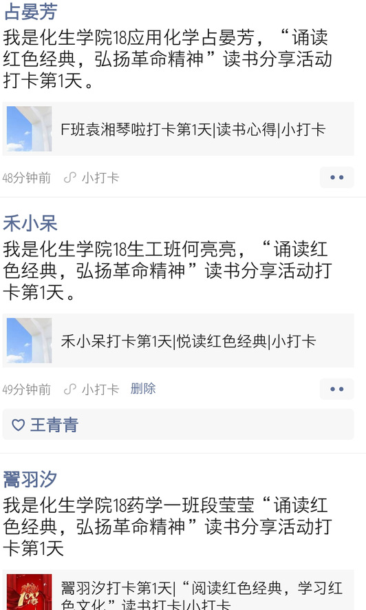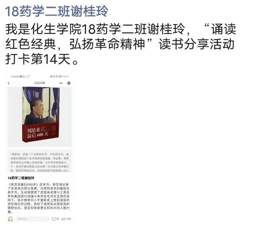 此次活动以微信小程序“小打卡”方式进行,在为期15天内学生党员每日将读书内容和读后感在网上打卡后分享到朋友圈即可。在活动进行期间,我院全体学生党员积极响应学院号召,纷纷在朋友圈晒出读书材料和读后心得,大家还在活动群对读书情况进行了探讨,读书学习氛围十分浓厚。“胸藏文墨若怀谷,腹有诗书气自华”,通过本次“诵读红色经典,弘扬革命精神”党史学习教育,既充分激发了大家热爱阅读、广泛阅读的兴趣和习惯的培养,又让学生党员们受到深刻的党性教育,这也是进一步落实党史学习教育的一项举措。
