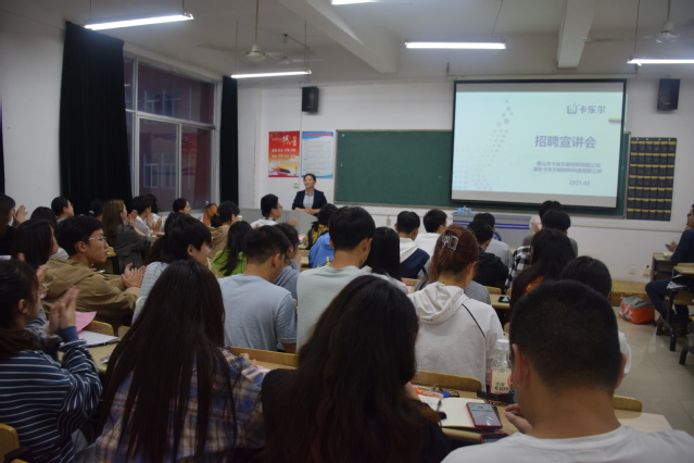 (学生通讯员 梅剑)我院为促进2021届毕业生在专业对口工作岗位顺利就业,5月18日下午,我院于二教楼举办佛山市卡乐尔新材料有限公司专场招聘会,学院18、17级学生参加了此次专项招聘会。会议由企业宣讲人主持。