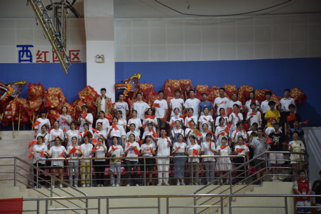 赛前,活动工作人员做好各项工作安排准备,引导各院观众入座,以确保比赛的顺利进行,室内炎热的空气仿佛同学们热情的催化剂,拉歌环节期间,观众为合唱的同学们加油鼓气,嘹亮的声音在体育馆久久回荡。