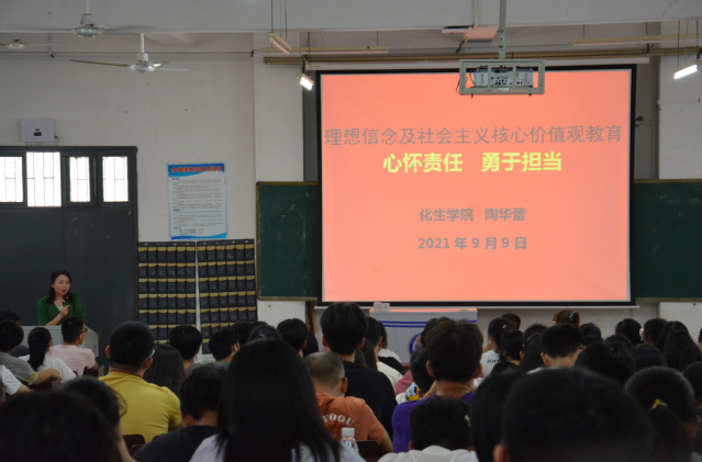 (学生通讯员 汤家源 张洪伟)为了激励2021级全体新生坚定理想信念,正确树立和大力弘扬社会主义核心价值观, 9月9日下午,我院于人文楼开展了理想信念及社会主义核心价值观教育讲座,讲座由我院党委副书记陶华蕾主讲。