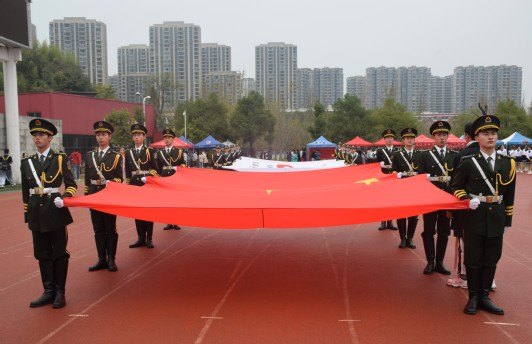 随着校运开幕式的徐徐进行,终于到了那万众瞩目的时刻。他们穿着整齐的军装,踏着整齐划一、铿锵有力的正步,以无声的庄严气势走向了升旗台。那一刻,全场肃穆,所有人都看着那一面鲜红的国旗,心中油然升起一股自豪和归属感。国歌纷扬,国旗手们擎旗、绑旗、扬旗,这其间的每一个动作都是那么干净利落,行云流水,令人敬佩。