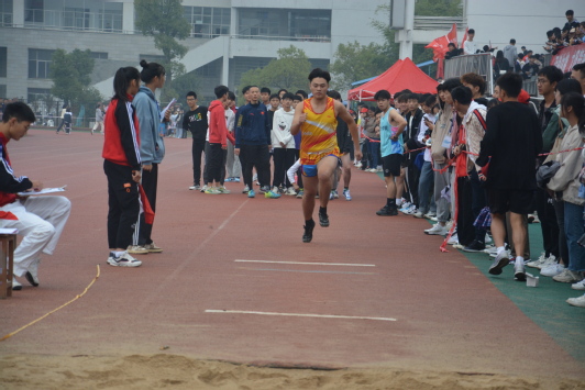 比赛一开始,现场气氛就变得紧张而又激动,围观的同学围了一圈又一圈,并时不时有人为选手加油打气。随着裁判的哨声响起,我院乐俊尧同学开始加速冲刺,离弦箭似的助跑、起跳、空中跨跃、收腹举腿,最终完美落入沙地,这一番操作化作优美的弧线,牵动所有观众的心,赢得了掌声和喝彩。最后经评定和测量,我院乐俊尧以11.39米的成绩荣获第六名。