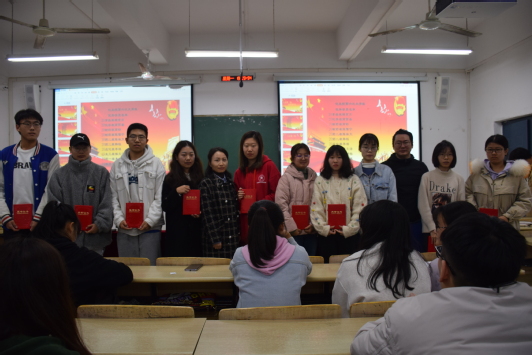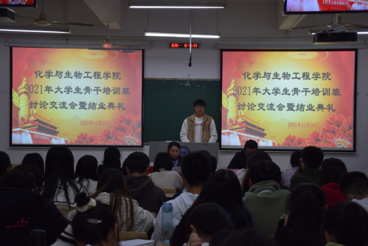 11月29日晚,“我院2021年大学生骨干培训班讨论交流会暨结业典礼”于二教楼举行,我院党委副书记陶华蕾,学生事务办公室(团委)副主任梁辉出席了本次典礼,大骨班全体成员参加。结业典礼上各学习小组代表上台发言分享学习心得体会。随后,陶华蕾作了讲话,她充分肯定了此次大骨班取得的成绩,对大家心得交流、互相进步表示了肯定,对全体学员提出了殷切期望,希望大家能志存高远,树立远大理想,脚踏实地,刻苦奋斗,做一个对国家、对人民有用的人。之后,梁辉宣读了优秀学员名单并颁发证书,最后,领导老师与优秀学员合影留念,活动在热烈氛围中圆满落幕。