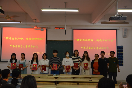 颁奖仪式伊始,中草药学社成员给大家介绍本次活动的背景和目的,讲解活动流程,公布获奖者名单。名单公布后,李君玲老师对获奖人进行颁奖以及合影留念。最后,李君玲老师对本次活动进行了总结。李君玲老师在总结中表达出对本次活动工作人员以及参与者的感谢,并希望每位同学都能积极参加中草药学社的活动。