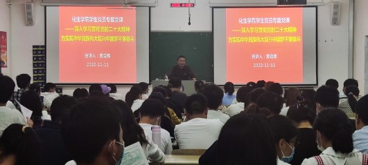 黄良辉以《深入学习贯彻党的二十大精神,为实现中华民族伟大复兴中国梦不懈奋斗》为题,向同学们作了精彩宣讲。他重点阐述了党的二十大的主题及重大意义,对党的二十大报告主要精神、习近平总书记在党的二十大期间的重要讲话精神、党的二十大通过的《中国共产党章程(修正案)》作了详细解读。他强调指出,学习宣传贯彻党的二十大精神是当前和今后一个时期全党全国的首要政治任务。作为青年学生党员尤其要深入学习领会党的二十大精神,深刻领会党的二十大的主题,深刻领会过去5年的工作和新时代10年的伟大变革,深刻领会开辟马克思主义中国化时代化新境界,深刻领会新时代新征程中国共产党的使命任务,深刻领会中国式现代化的中国特色和本质要求,深刻领会党的二十大各项重大部署,把思想和行动统一到党的二十大精神上来,深刻领悟“两个确立”的决定性意义,增强“四个意识”、坚定“四个自信”、做到“两个维护”,坚定不移在思想上政治上行动上同以习近平同志为核心的党中央保持高度一致,以实际行动践行对党忠诚。他勉励学生党员要进一步坚定理想信念,坚定不移听党话跟党走,锤炼意志品质,勇于担当使命,努力奋发进取,练就过硬本领,矢志艰苦奋斗,为全面建设社会主义现代化国家、实现中华民族伟大复兴的中国梦贡献自己的青春力量。
