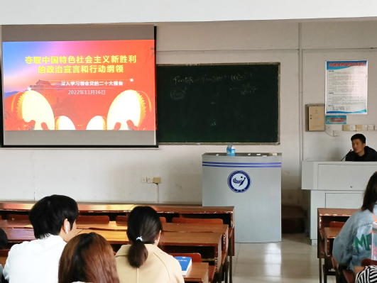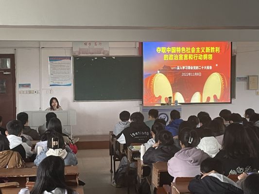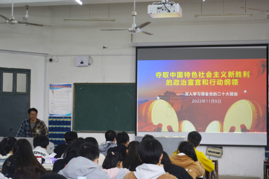 课上,四位宣讲老师以《夺取中国特色社会主义新胜利的政治宣言和行动纲领》为题,就党的二十大召开的时代背景和重大意义、大会主题和党的二十大报告重要精神,深入浅出的作了系统阐释解读。老师们强调指出,党的二十大是在全党全国各族人民迈上全面建设社会主义现代化国家新征程、向第二个百年奋斗目标进军的关键时刻召开的一次十分重要的大会,必将成为实现中华民族伟大复兴进程中的重要里程碑。宣讲过程中,老师们首先以党的百年历史为主线,从党的一大到二十大简要回顾了中国共产党走过的百年光辉历程,重点讲述了党的十八大以来新时代十年取得的伟大成就和发生伟大变革,指出新时代10年的伟大变革具有里程碑意义。老师们在解读党的二十大报告时强调,党的二十大报告深刻阐释了新时代坚持和发展中国特色社会主义的一系列重大理论和实践问题,描绘了全面建设社会主义现代化国家、全面推进中华民族伟大复兴的宏伟蓝图,为新时代新征程党和国家事业发展、实现第二个百年奋斗目标指明了前进方向、确立了行动指南,是党团结带领全国各族人民夺取中国特色社会主义新胜利的政治宣言和行动纲领。宣讲会最后,老师们勉励同学们要深入学习领会党的二十大精神,坚定不移听党话、跟党走,立志做有理想、敢担当、能吃苦、肯奋斗的新时代好青年,让青春在全面建设社会主义现代化国家的火热实践中绽放绚丽之花,为实现中华民族的伟大复兴的中国梦贡献自己的青春力量。