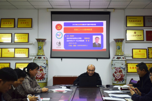 (学生通讯员 付兴月 许坤铭)11月23日下午,我院在院会议室开展了一次党员学习贯彻党的二十大精神培训班专题党课,特邀我校马克思主义学院党委书记朱向华教授宣讲党的二十大精神。本次党课由院党委书记黄良辉主持,全体教工党员参加了党课学习。