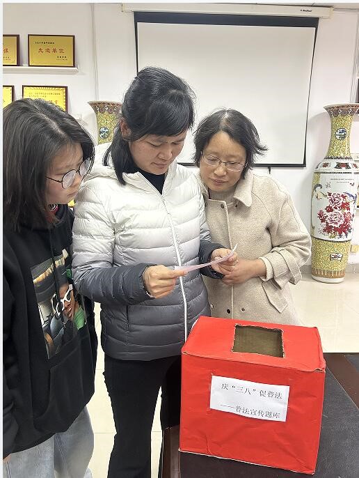 本次宣传教育活动以团队知识竞赛答题形式开展,答题设置两个环节,必答环节和抢答环节,在规定的时间内答题累计分数最高的队获胜。活动现场气氛紧张热烈,各女教工团队沉着应战,冷静思考、敏捷反应,充分发挥了团结协作的精神,精妙答题博得了现场观众的热烈掌声。