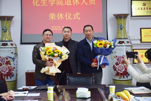 (学生通讯员 胡润苗)3月21日下午,我院为陈三宝、黄皓两位退休教授举行了荣休仪式。校党委委员、副校长严青松、离退休人员工作处处长周卫平、人事处副处长王俊峰、校工会副主席姜敏出席,院长郭孟萍、院党委书记黄良辉、院党委副书记陶华蕾和相关教研室教师代表参加了荣休仪式。荣休仪式由黄良辉主持。