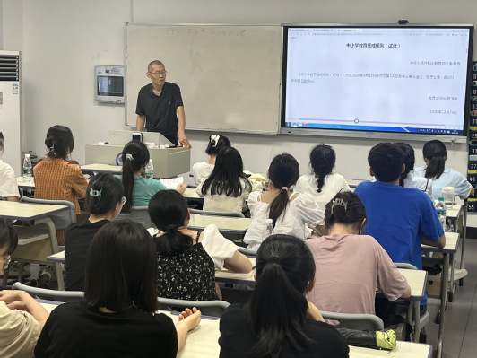 7月5日上午化学专业负责人杜玉昌老师主要围绕教育法、教师法、中小学教育惩戒规则(试行)等文件给同学们讲解了实习从教过程中应该遵循的法律法规,结合实例讲解了课堂教学与班级管理实施过程中应注意的一些事项,并对实习生们提出了一些要求,强调实习生在实习期间,要服从学校和实习单位的安排。下午的培训主要强调了实习过程中实习生学业方面的主要任务,实习考核标准与实习档案材料以及实习纪律注意事项等问题。