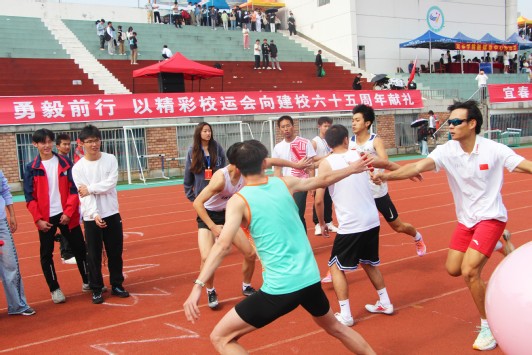 操场上运动员们在各自的位置上摆好冲刺的姿势,有力的目光直射前方,只听一声枪响,第一棒的运动员们弹射起步犹如出笼的猛虎,向下一棒奔去。跑道旁飞舞的院旗标志着每个参赛运动员们当前的位置,接力棒在运动员们手中不间断的快速传递,平日的努力在这一刻得以展现,小小的接力棒上承载着每位运动员独属于自己的荣耀、团结与友爱,青春的速度、激情与活力在他们身上展现的淋漓尽致。