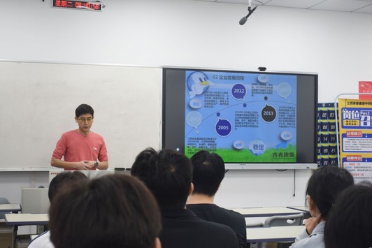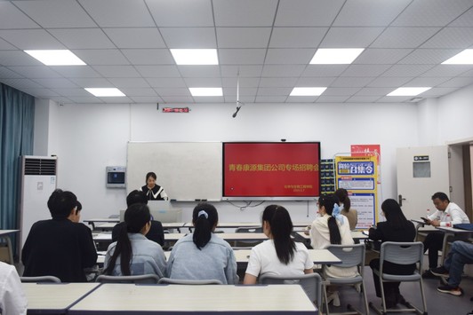 招聘会伊始,公司负责人李芳向同学们一一介绍此次出席招聘会的公司人员。随后,公司负责人以 PPT 的形式就公司的规章制度、福利待遇、企业文化、现有产业结构、组织构架、人力资源政策以及招聘岗位等几个方面向同学们做详细介绍。随后,公司人员现场根据同学们提出疑问做出解答。最后,有就业意向的同学投递了简历。