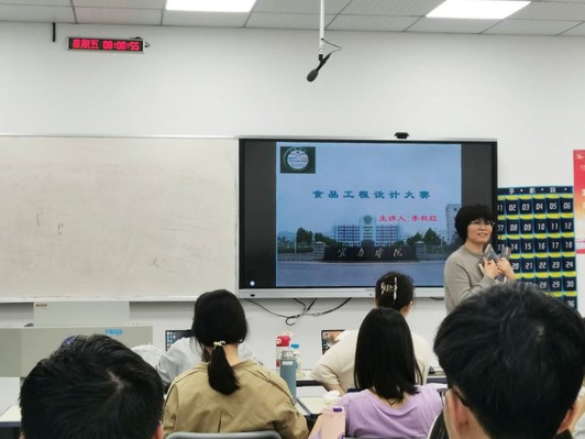 为提高同学们的创新精神和实践能力,4月26日,我院于二教楼教室举办食品工程设计大赛。本次比赛由我院食品质量与安全专业负责人叶文峰、食品质量与安全教研室主任李秋红进行指导、点评和打分,21级食品质量与安全班级全体学生参与。本次大赛强调思维创新及团队协作能力,大赛伊始,七个小组抽签决定上场顺序。随后,各小组汇报人通过演示PPT来展现设计内容,其中包含厂址选择、产品工艺流程设计、设备选型、水电气衡算和工厂周边绿化等多方面流程。随后,老师们根据学生设计的合理性、规范性进行全面评价,并提出其存在的不足。