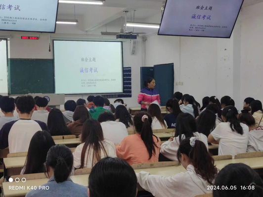 6月5日,我院各班级开展以诚信为主题的班会,会议由各班级带班老师主持。会议内容涉及到国家和省级资助政策的宣讲、征信及信用的相关知识、诚信和感恩的重要意义,尤其讲述到诚信应考的内涵意义、考试作弊的后果和校规校纪等内容。各带班老师在讲述班会内容的时候重点激励学生们积极复习,并祝愿学生们在考试中取得优异成绩。