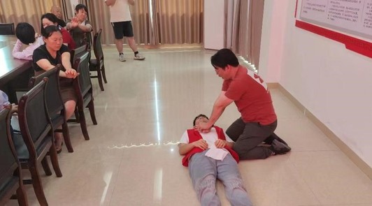 下午,梁辉作为主讲人为社区工作人员及居民上了一堂生动有趣的应急救护课。梁辉及队伍成员们通过生动的实例和通俗易懂的语言向“学生”们讲解了外伤出血、鱼骨卡喉、晕倒、溺水等各种日常突发状况的应对措施,演示了包扎、心肺复苏、海姆利克急救法等基本救护技能。宣讲中还穿插了互动问答环节,增加了宣讲的趣味性和实用性。如在应对烫伤时,一位“学生”表示自己在遇到这种情况时都是在烫伤表面涂抹酱油或牙膏,志愿者们立即提指出这些方法的不妥之处,并在讲解中演示了正确的处理方法。