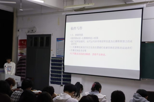 会议伊始,郑梦双对校运会的任务安排进行分配,保证所有任务有条不紊地推进。接着,瞿蓉对校运稿件进行介绍,她阐明校运校运广播稿分为赛事稿和散文稿,并对赛事稿和散文稿进行讲解,帮助各位记者站成员进一步了解校运广播稿。随后,陈庆渡对校运会新闻及散文进行详细讲解,阐述校运广播稿的特点,并对稿件写作的内容提了四点要求:直切主题,立意要新颖;抓住特点,挖掘内涵;运用排比,比喻等修辞;避免虚假浮夸,要有现场感。最后,彭翔对记者站全体成员进行激励,希望每位干事都能以更加饱满的状态投入到宣传报道之中。会议在热烈的掌声中落下帷幕。
