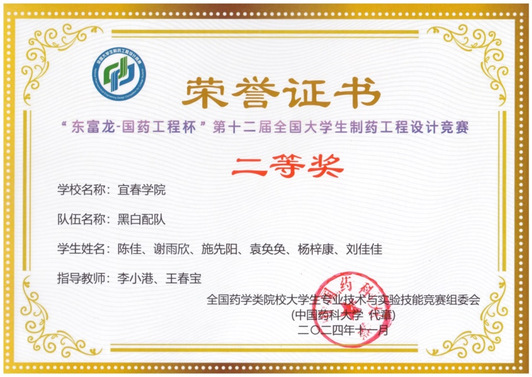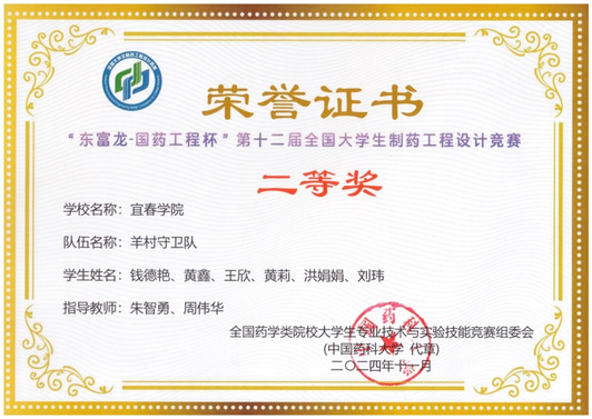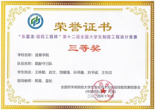 (特约通讯员 王春宝 陶华蕾)近期获悉,我院学子在“东富龙-国药工程杯”第十二届全国大学生制药工程设计竞赛再创佳绩。此次大赛是由全国药学类院校大学生专业技术与实验技能竞赛组委会主办、东富龙科技集团股份有限公司与中国医药集团联合工程有限公司协办、重庆理工大学承办。该项赛事是目前我国高校制药工程专业层次最高、最有影响力的高水平专业赛事,是教育部高等学校药学类专业教学指导委员会指导推进制药工程专业发展的重要抓手。此次大赛共吸引180所高校参加,每所高校参与队伍数量不超过三支。