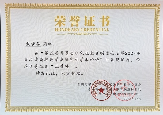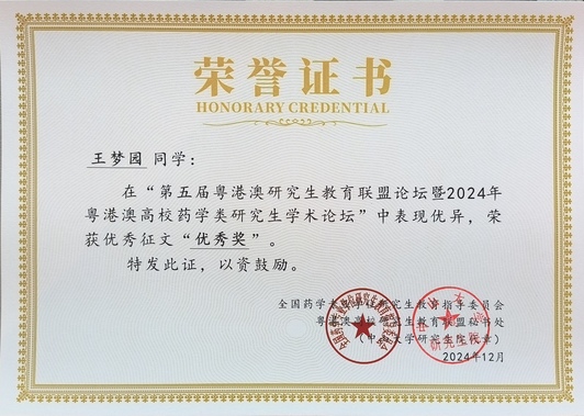 大会前期面向全国高校征集优秀论文,共得到来自56所院校的投稿论文229篇,经论坛组委会组织专家评审后,最终遴选出获奖论文126篇,其中一等奖5篇,二等奖26篇,三等奖33篇,优秀奖62篇,优秀组织10项。其中我院2022级药学硕士研究生戴梦茹荣获优秀征文“三等奖”,2022级赵宇超、黄江萍和2023级王梦园等荣获优秀征文“优秀奖”。